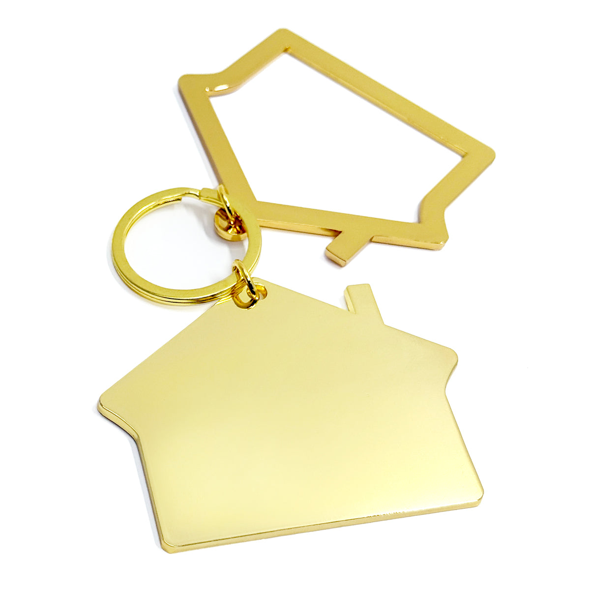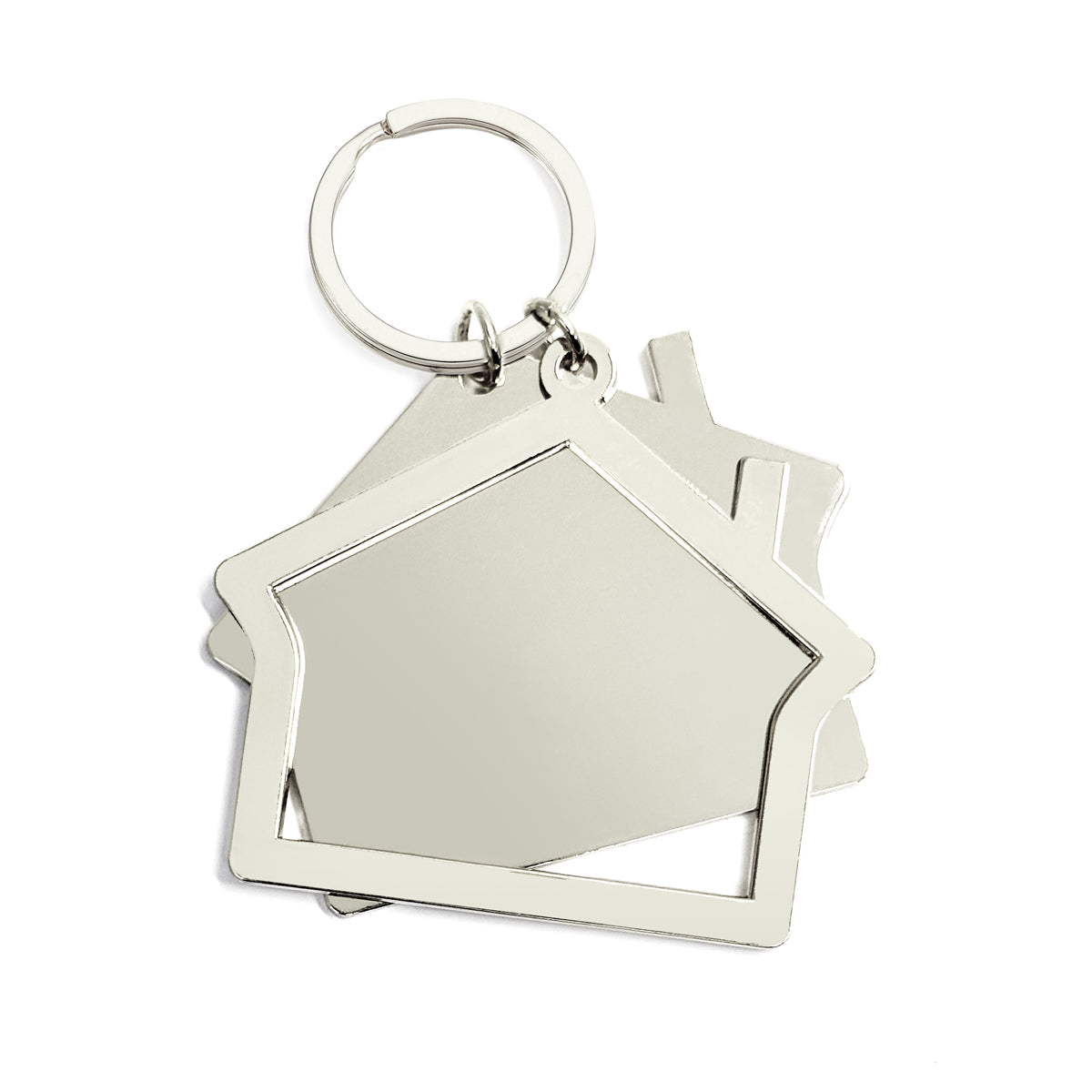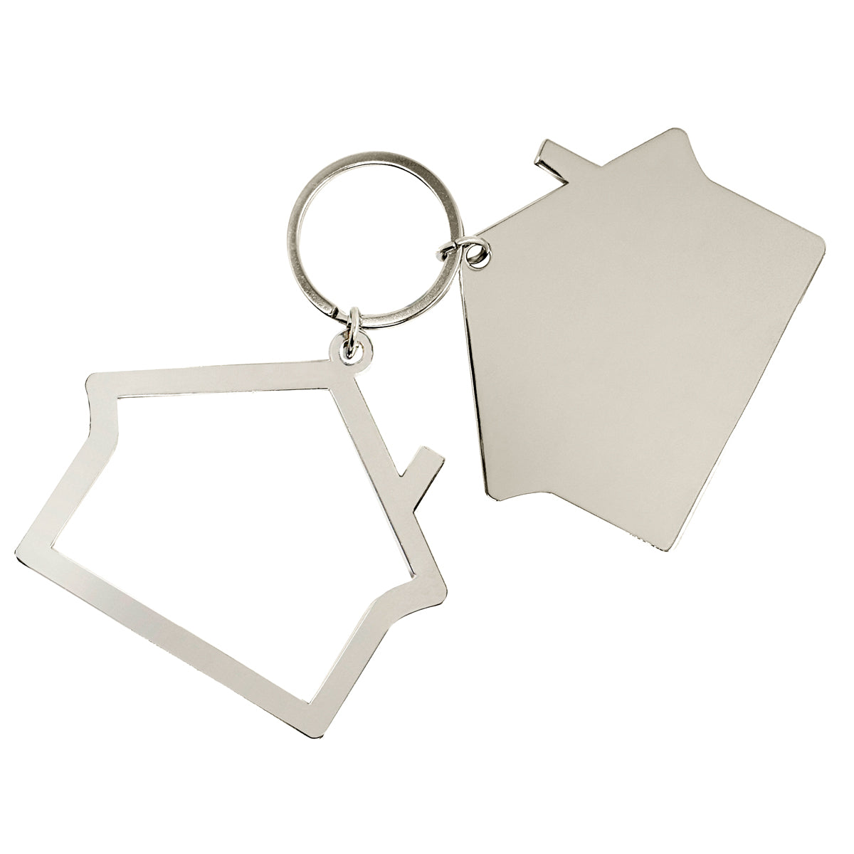 This double house metal key ring features two attached house shapes—one solid and one open outline—symbolizing both the structure and the story behind a new home.