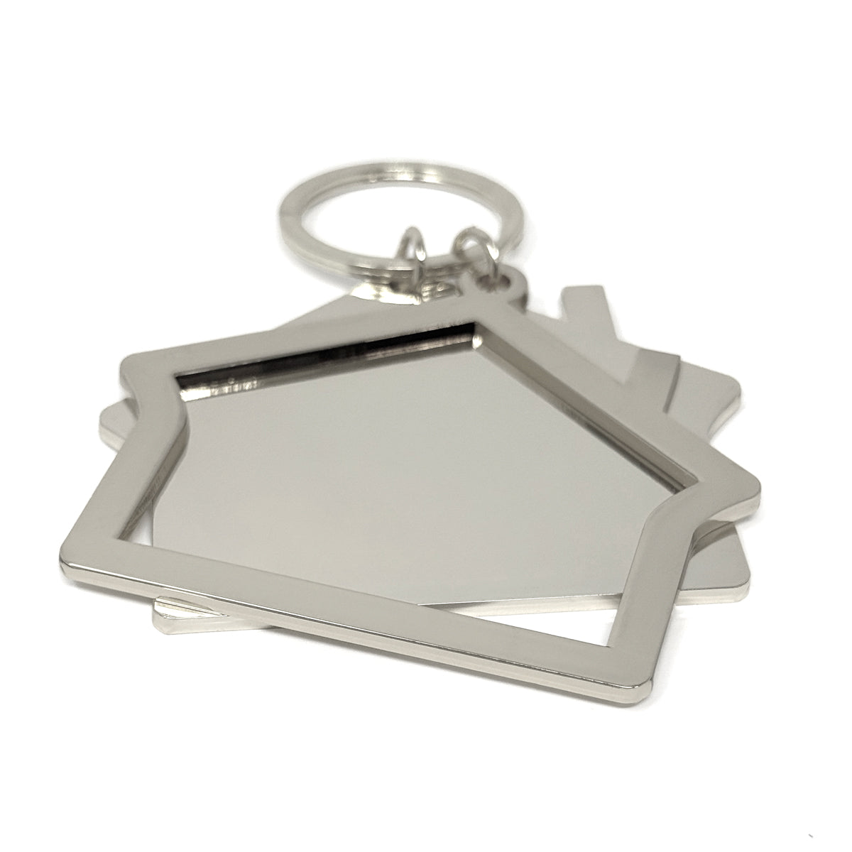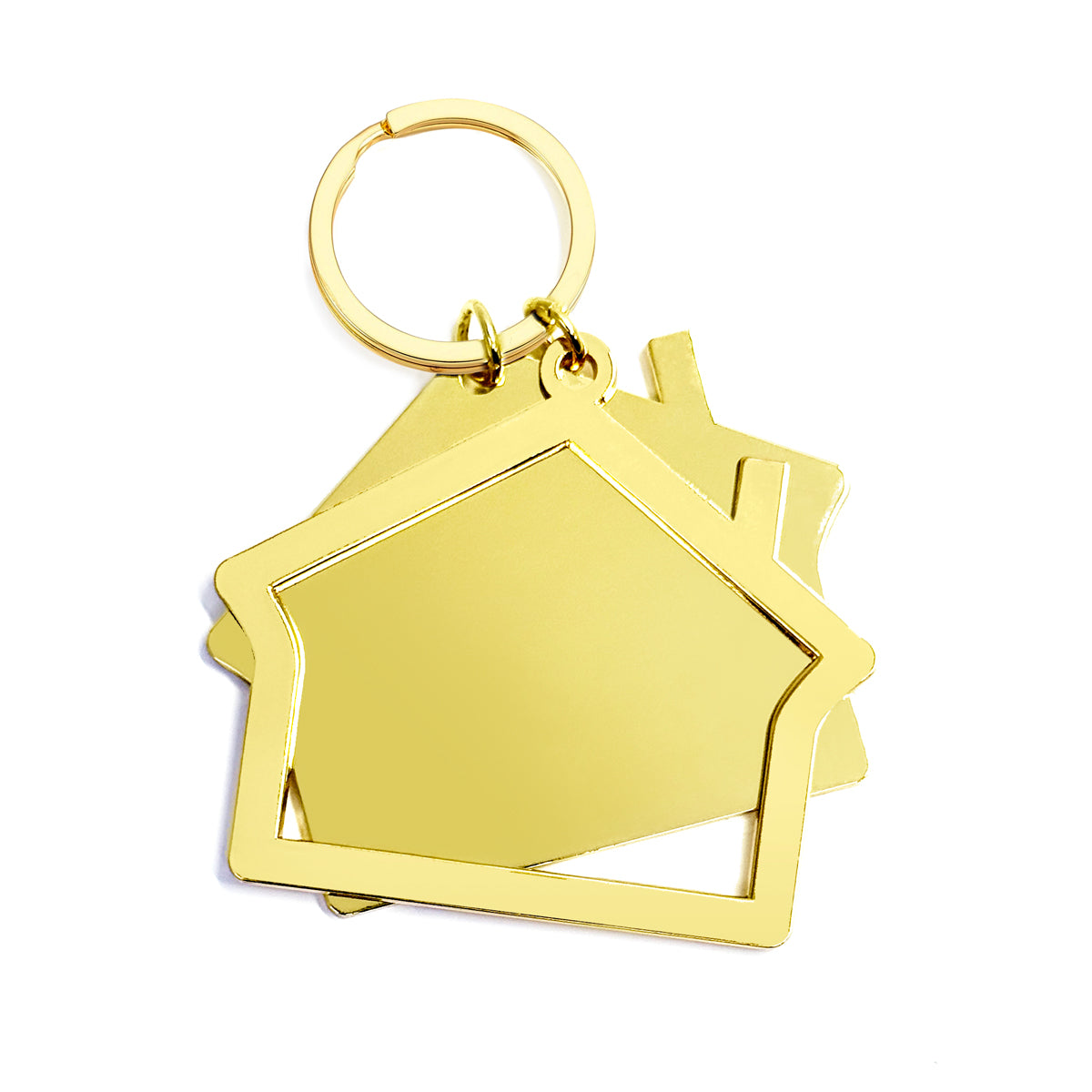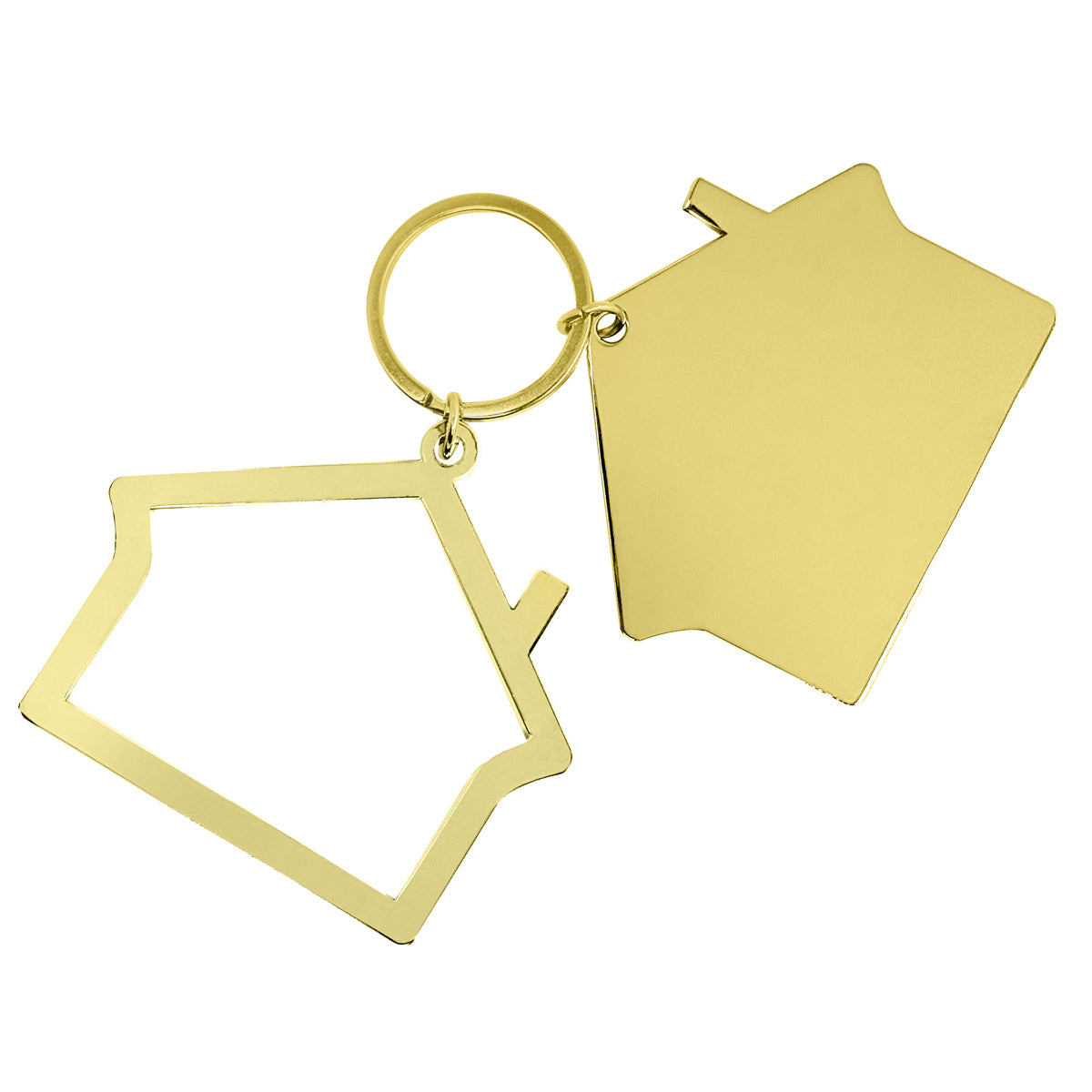 This double house metal key ring features two attached house shapes—one solid and one open outline—symbolizing both the structure and the story behind a new home.