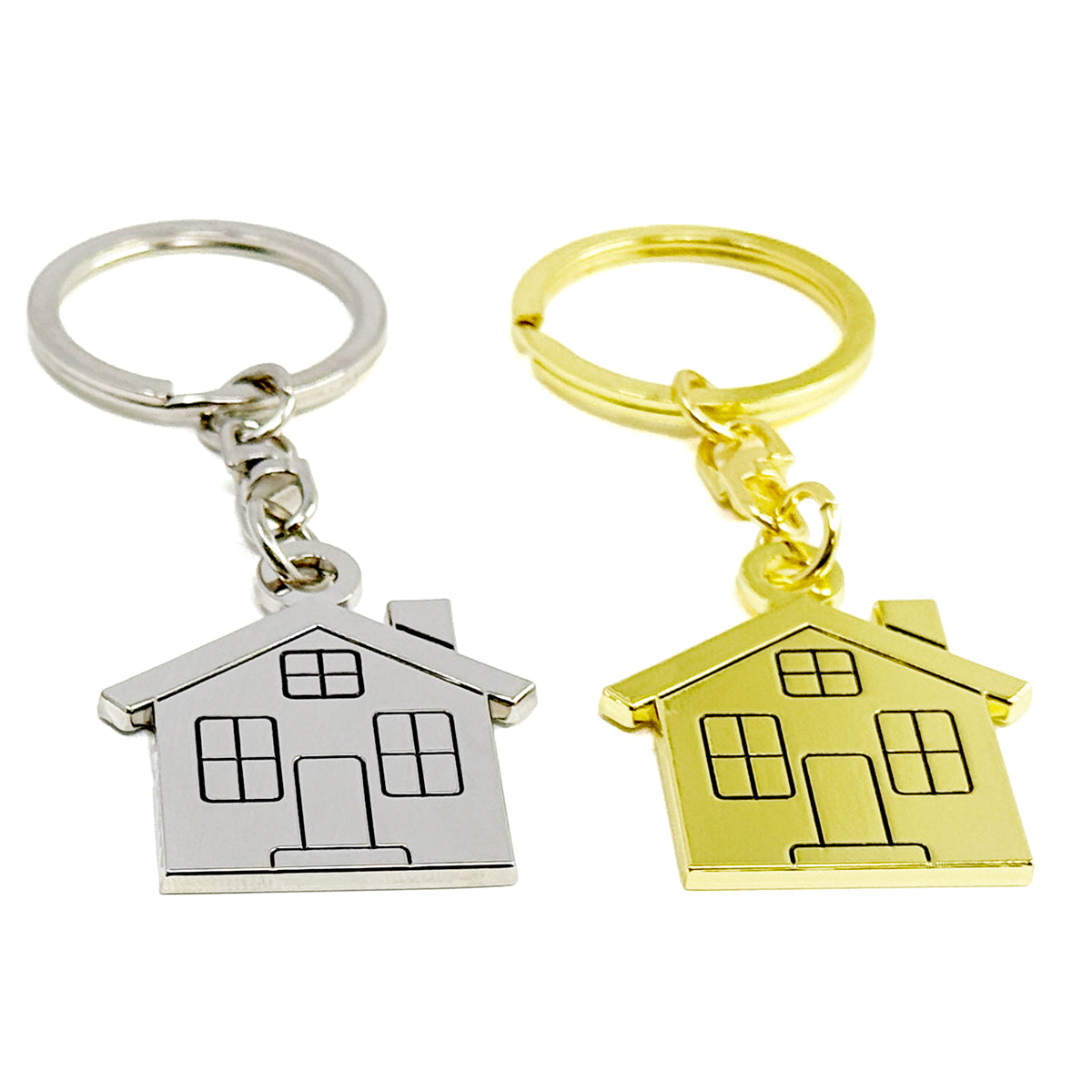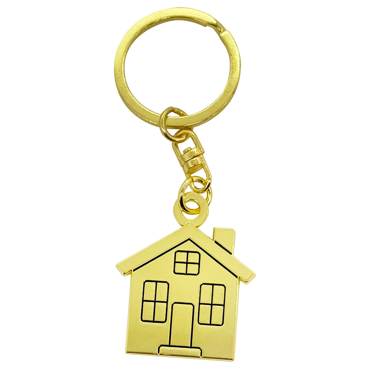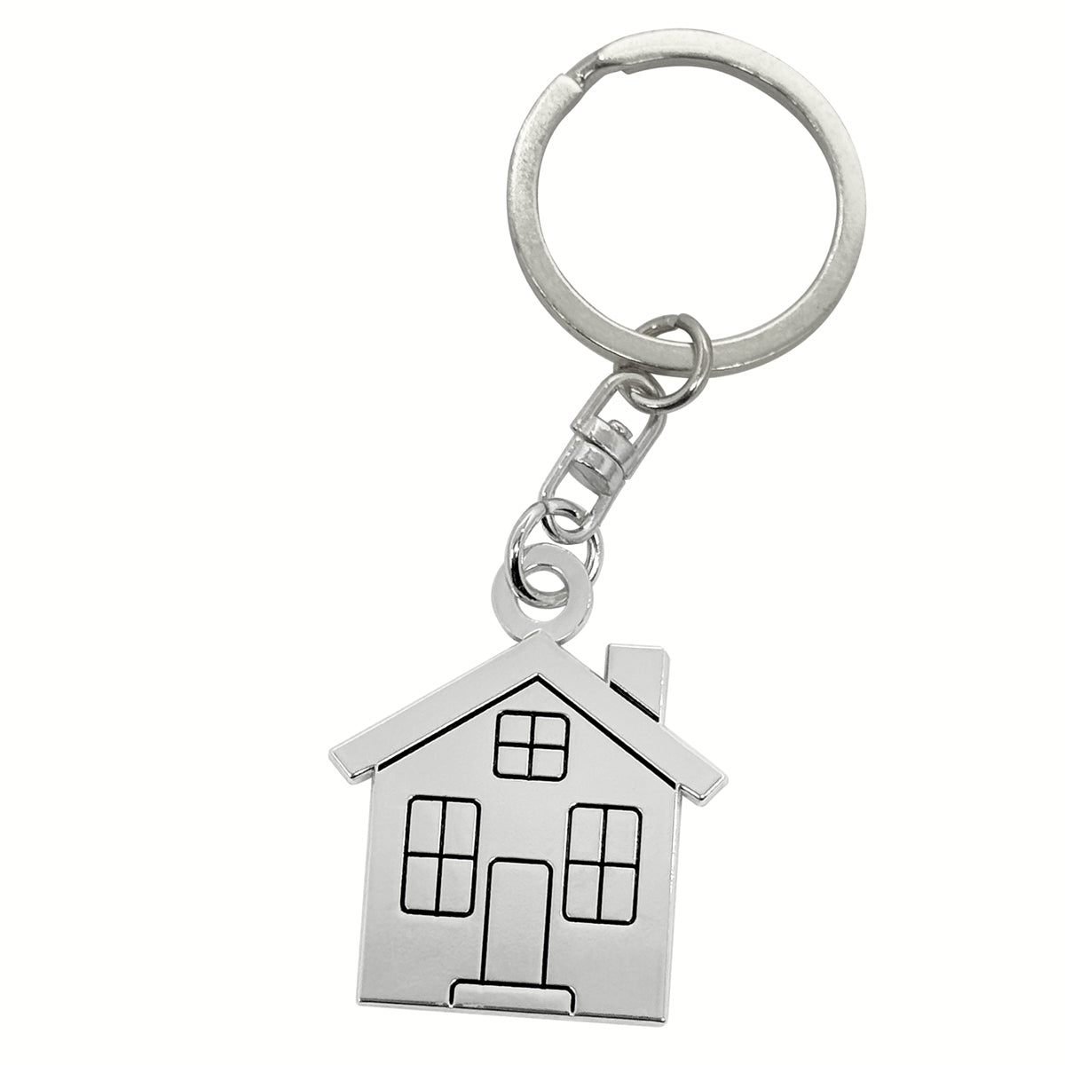 This stamped house-shaped metal key ring features clean lines and subtle etched details for a timeless, professional look that works for any client.