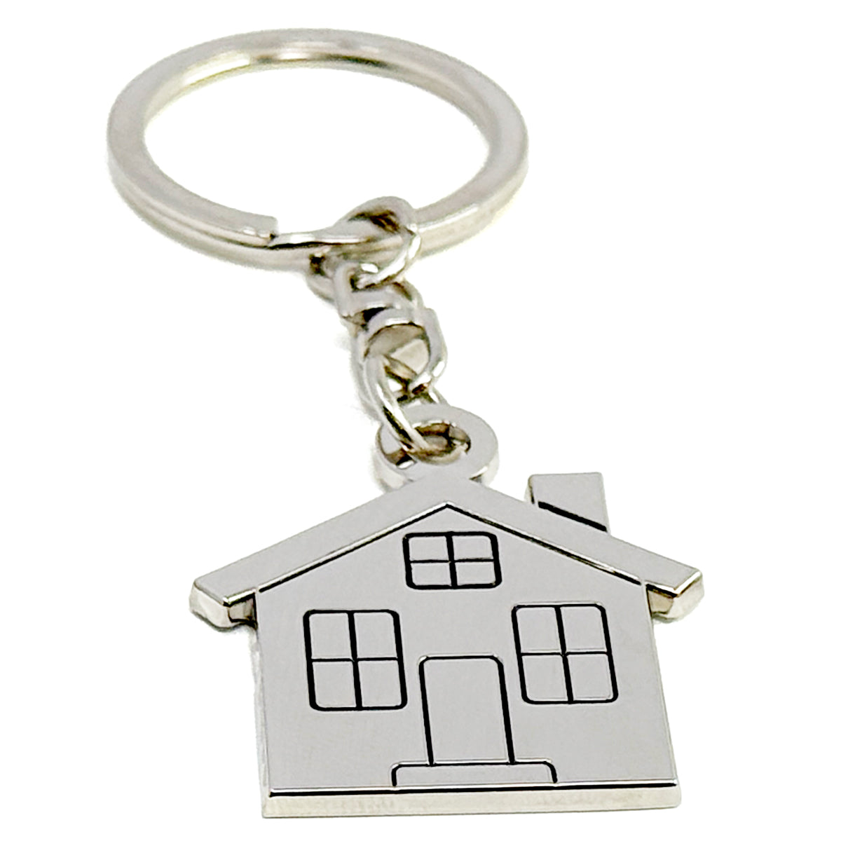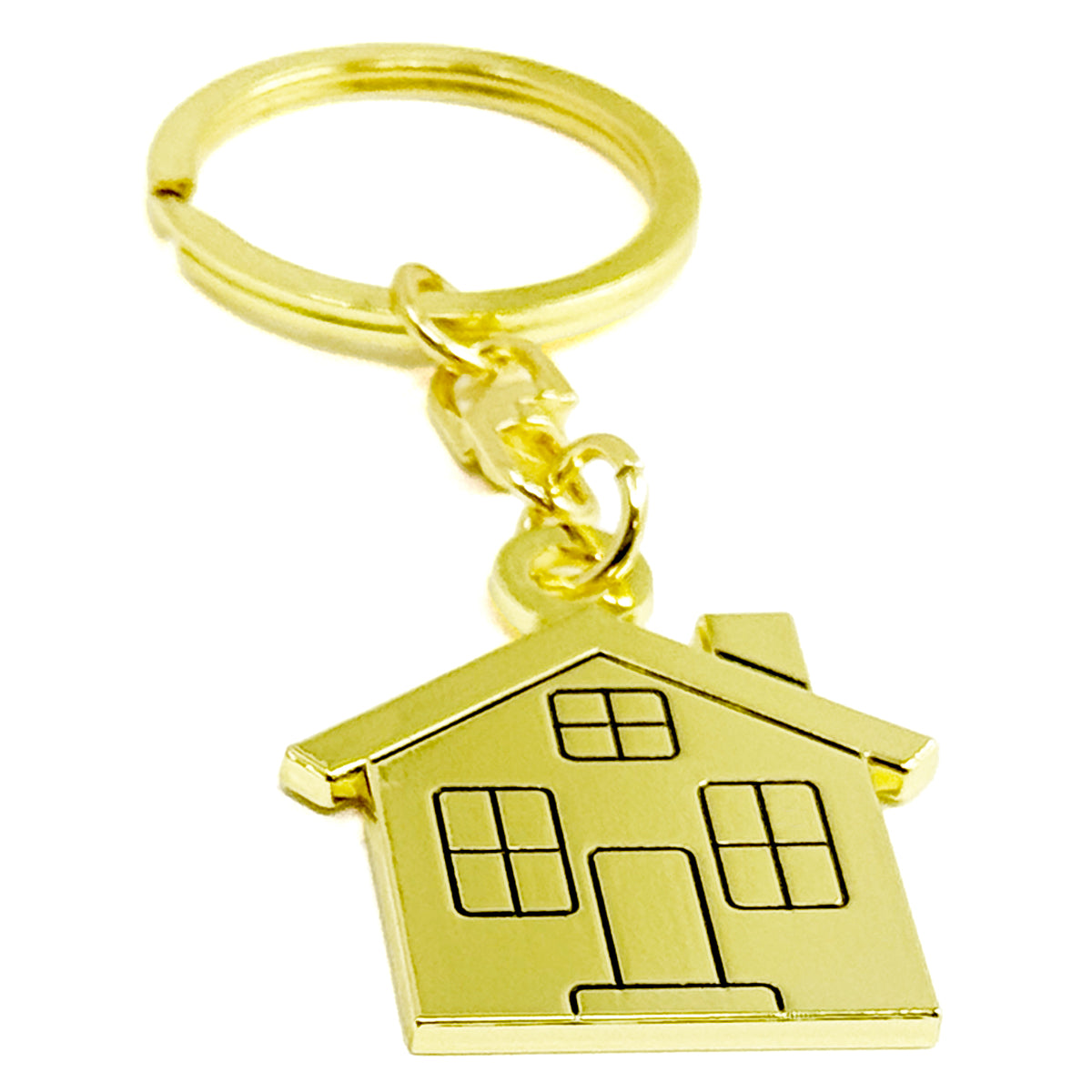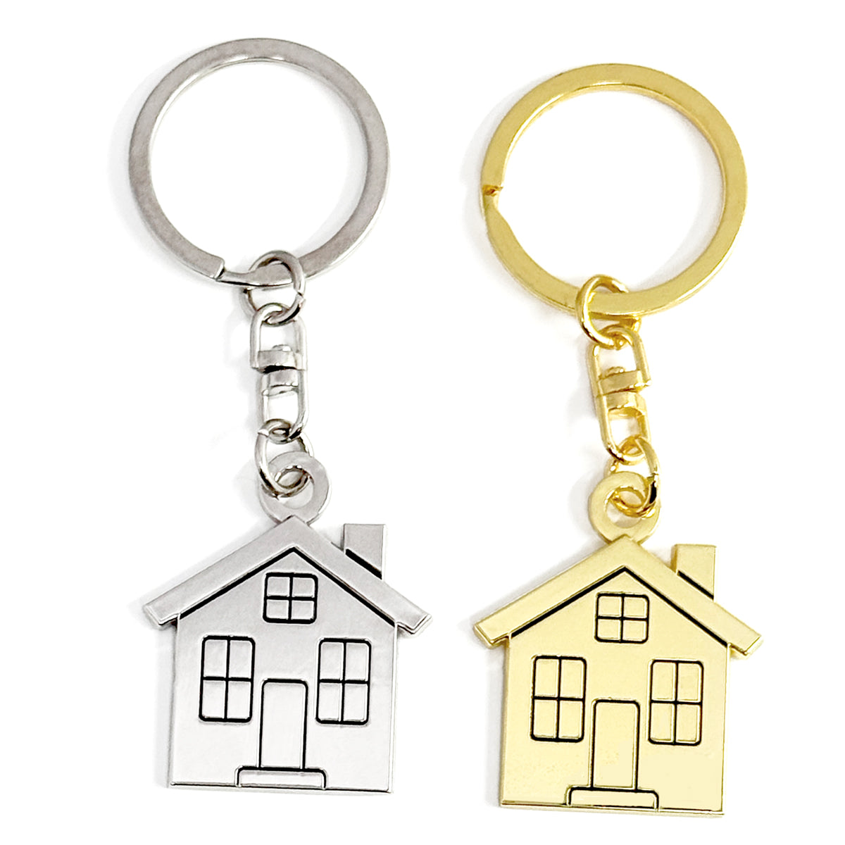 This stamped house-shaped metal key ring features clean lines and subtle etched details for a timeless, professional look that works for any client.