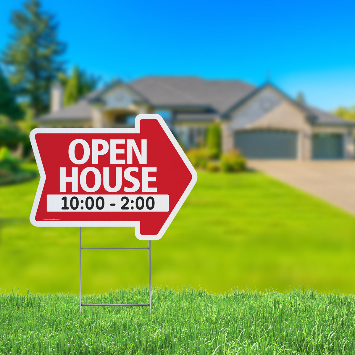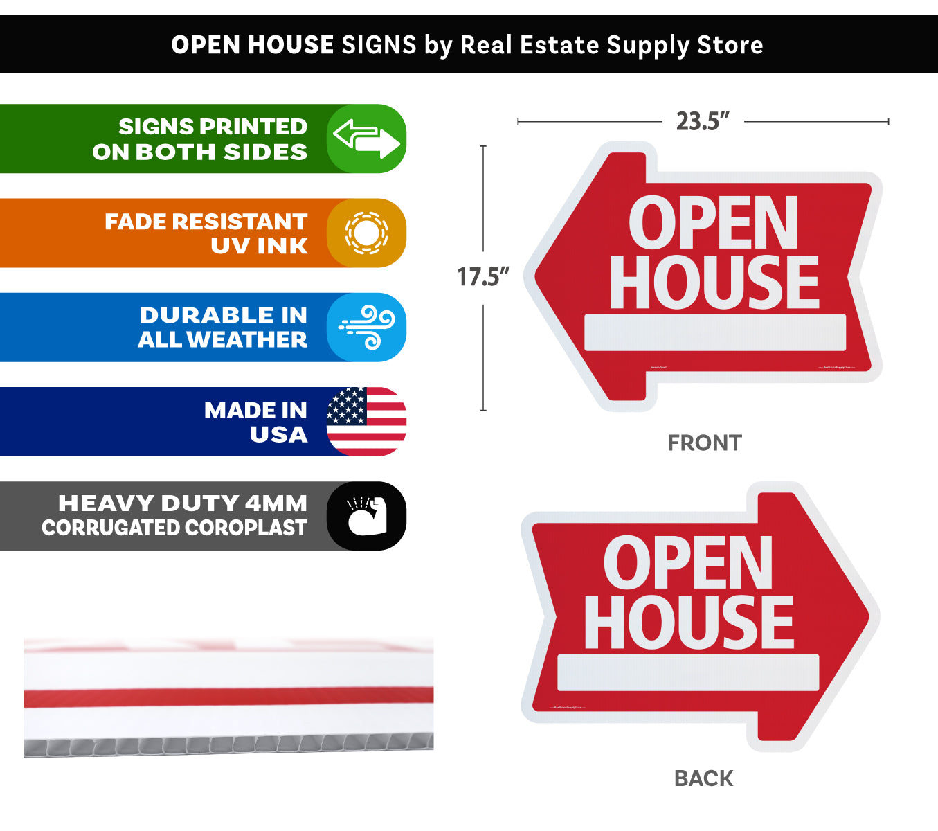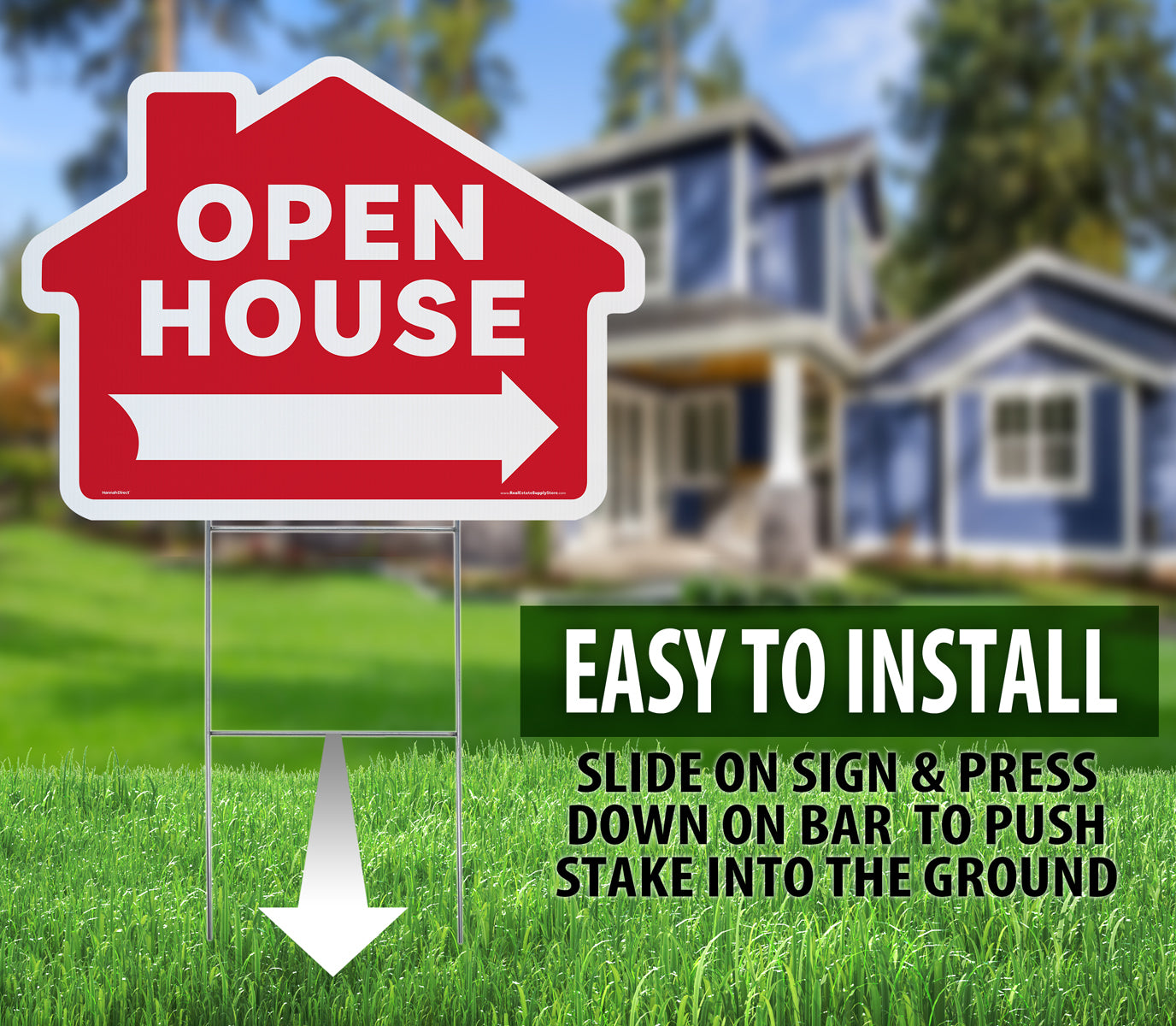 This Combo Kit has 2 Open House Signs - one is House Shaped & the other is Arrow Shaped. Place the House Shaped one in front of the house hosting an Open House and the use the other for directional signage down the street. This combo kit also comes with yard stakes so you are Ready to SELL!!