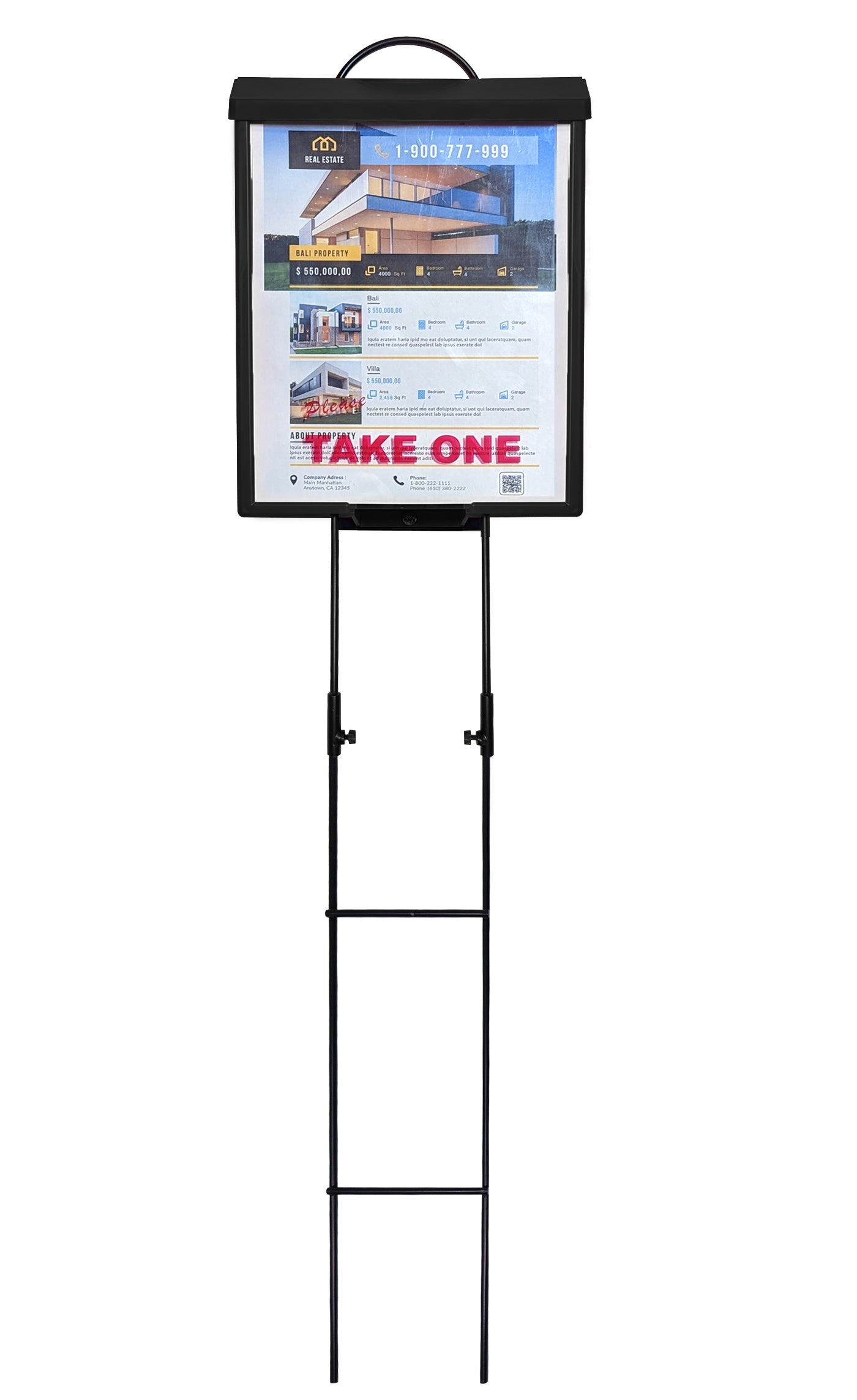 This outdoor flyer and brochure box is designed for secure, professional display at real estate listings, open houses, and outdoor events. The brochure box is bolted to a sturdy metal yard stake for easy carrying and reliable ground installation, with a built-in foot bar that allows you to step the stake directly into the ground.